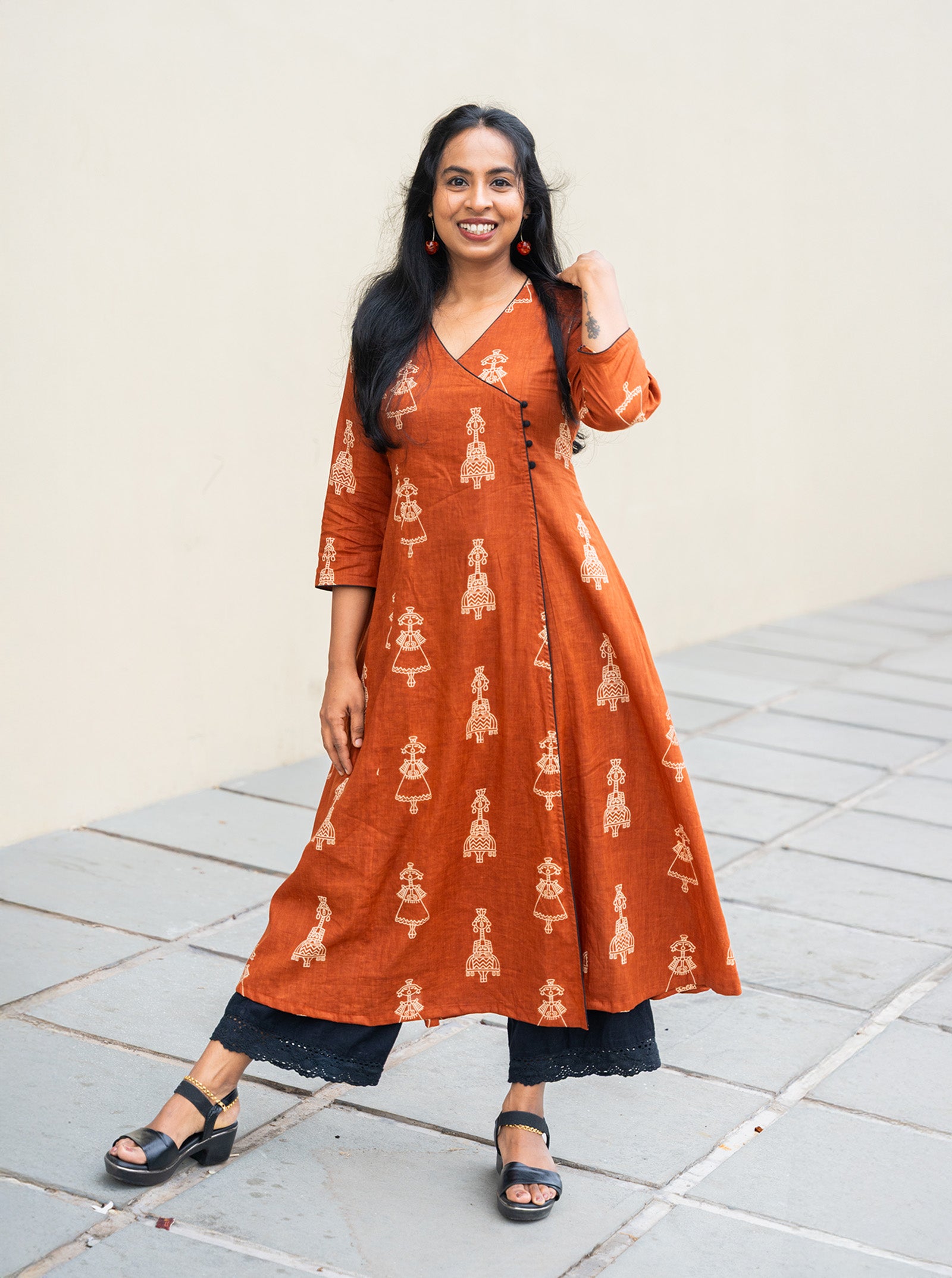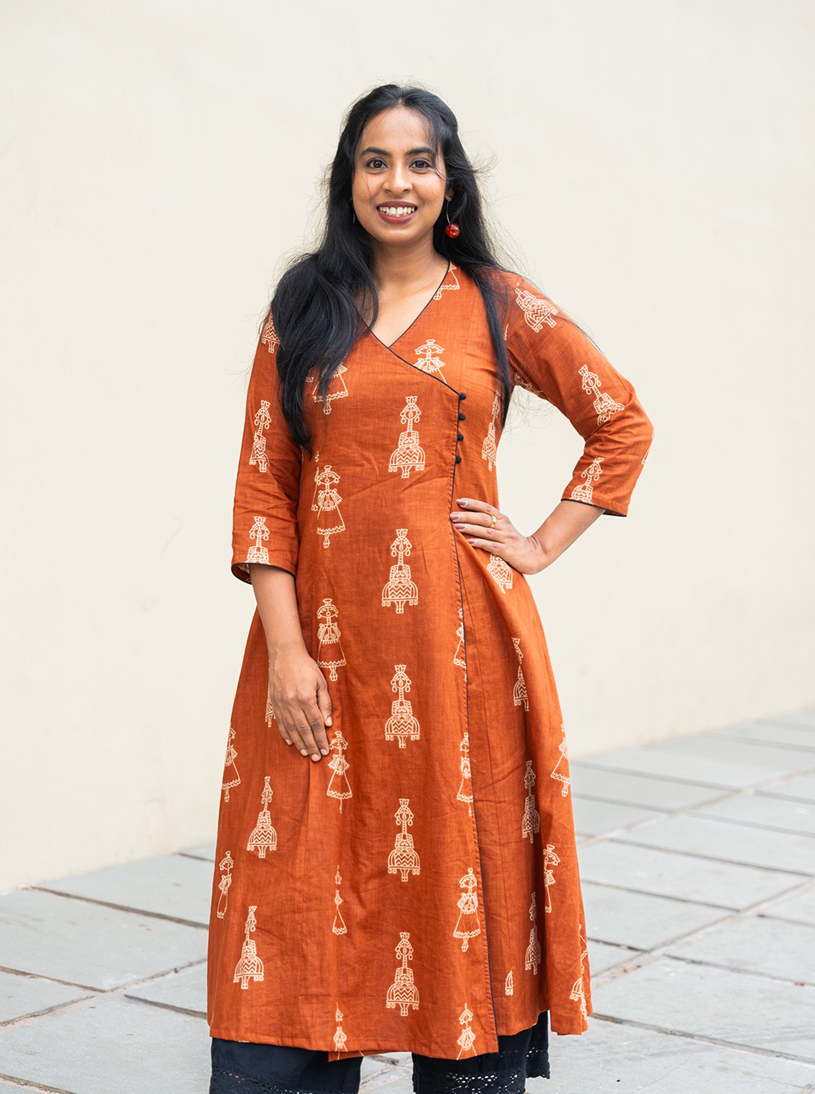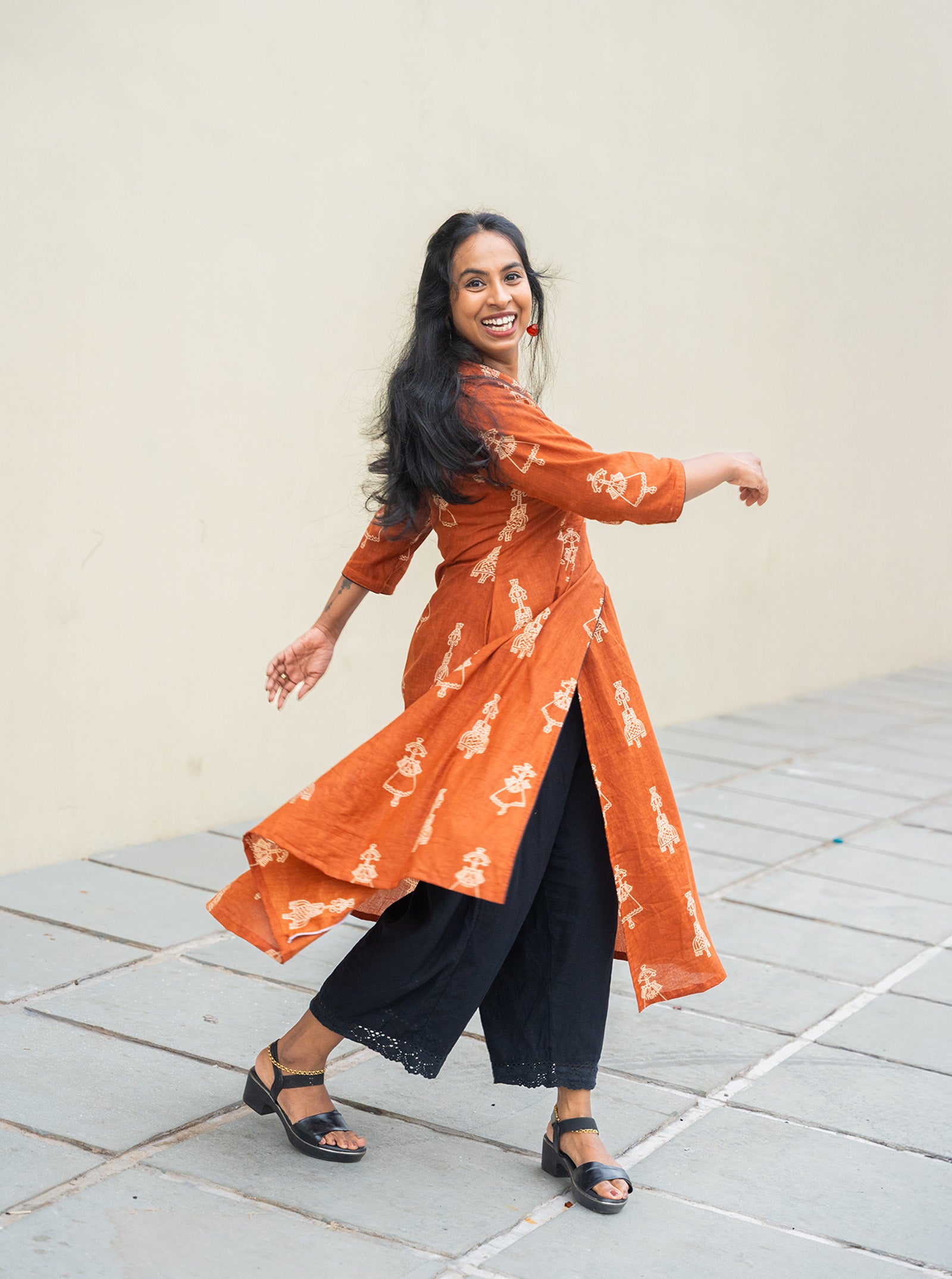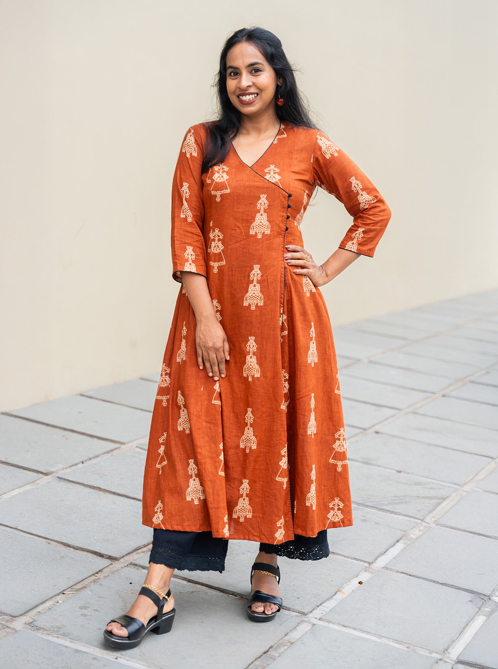 This beautiful rust-orange kurta brings together traditional charm and modern comfort. Crafted in a soft, breathable fabric, it features delicate all-over ethnic prints that add a timeless appeal. The V-neckline with side button detailing enhances the silhouette, while the three-quarter sleeves make it perfect for all-day wear.